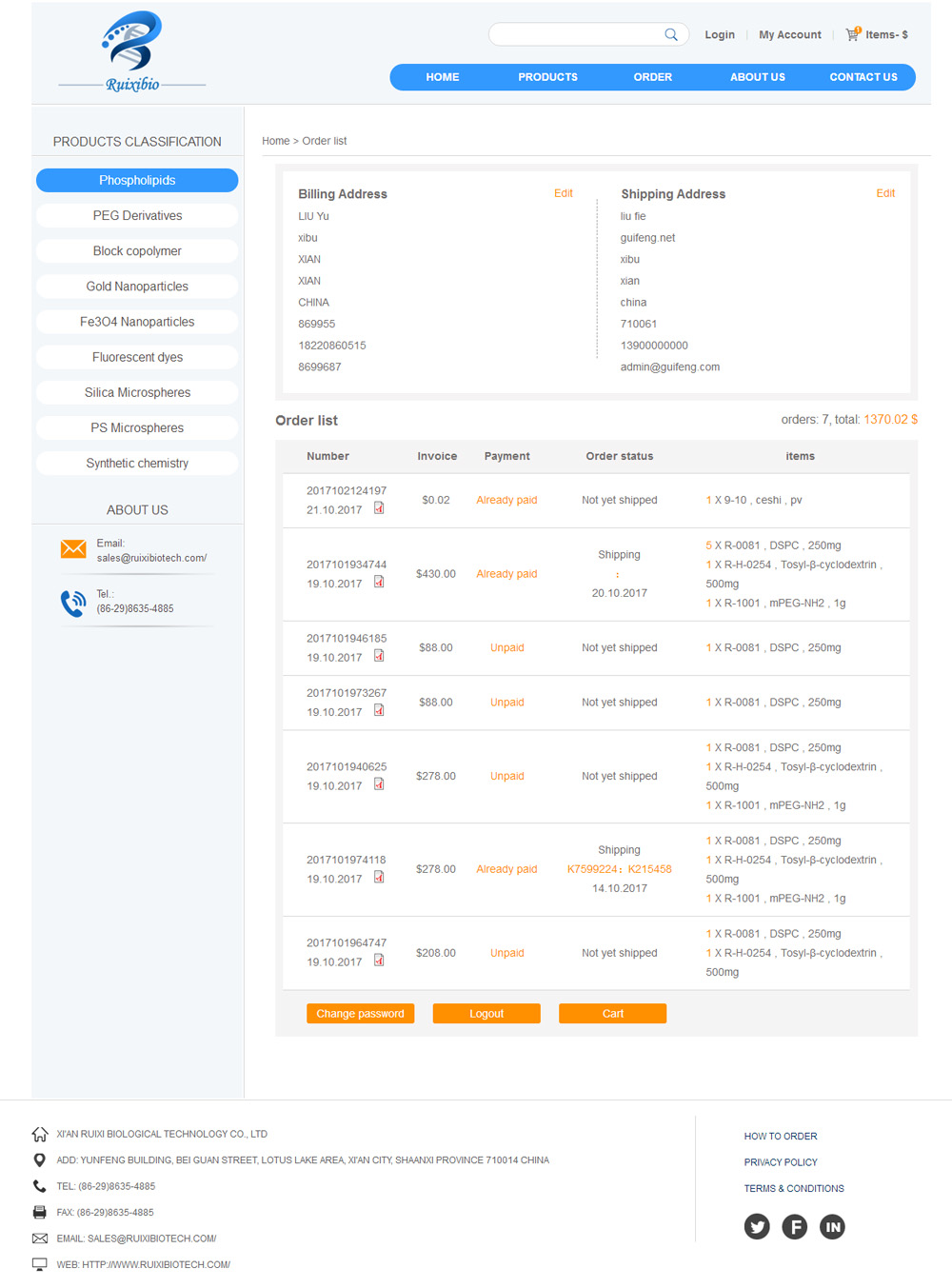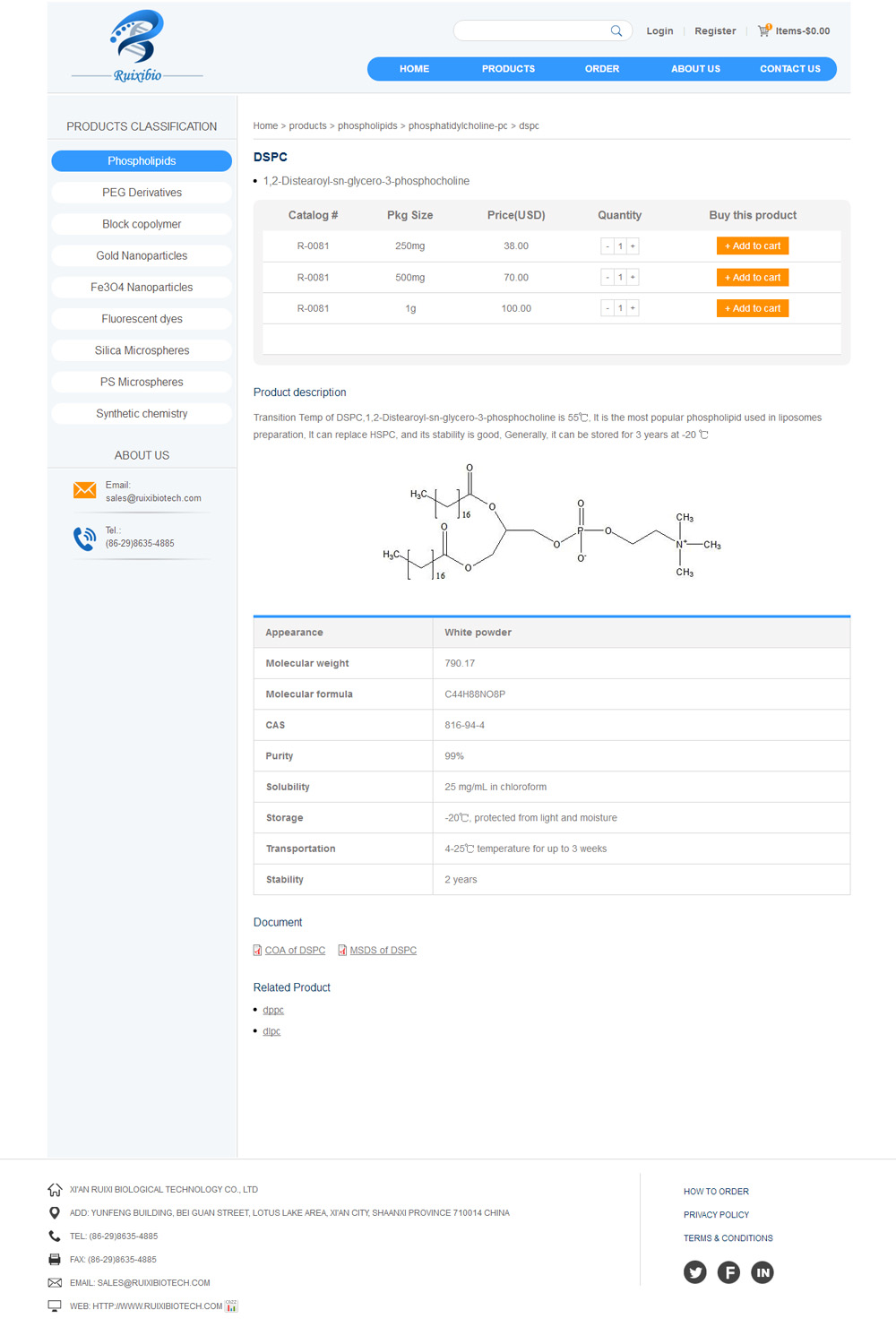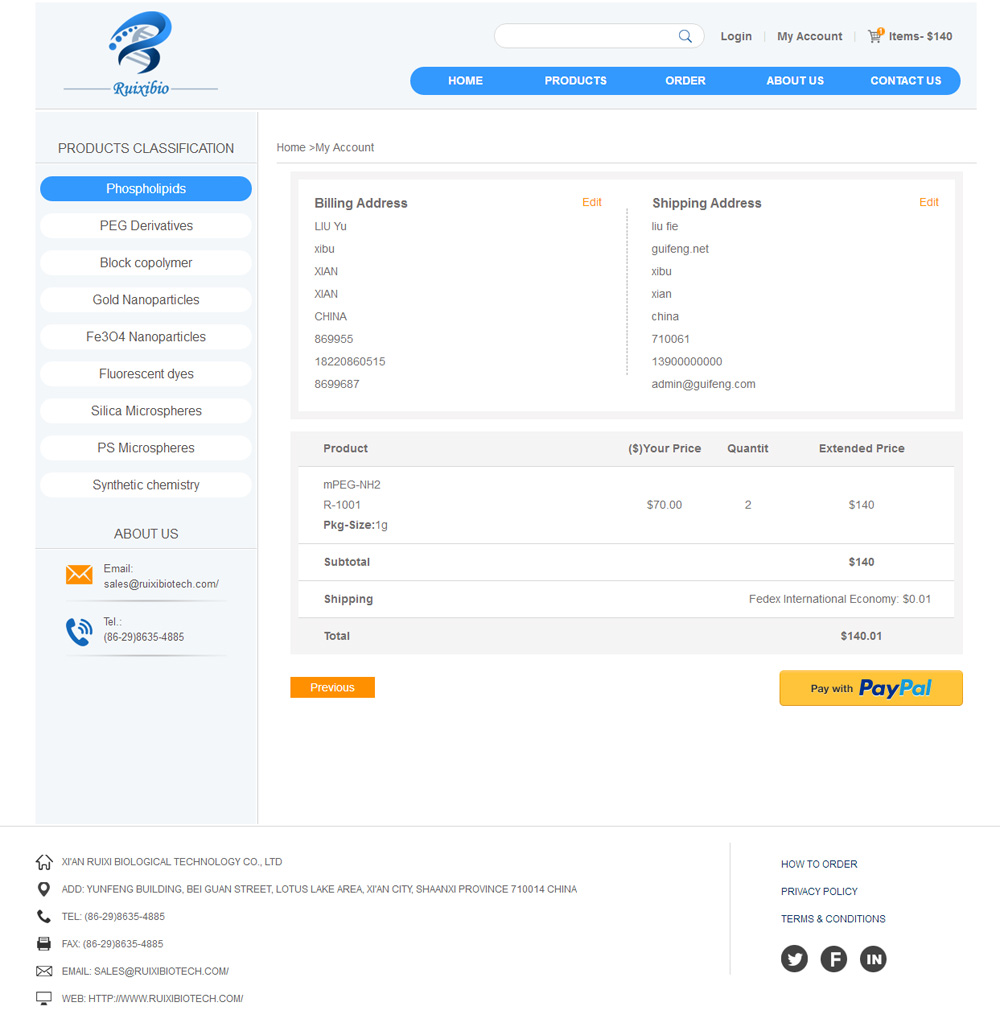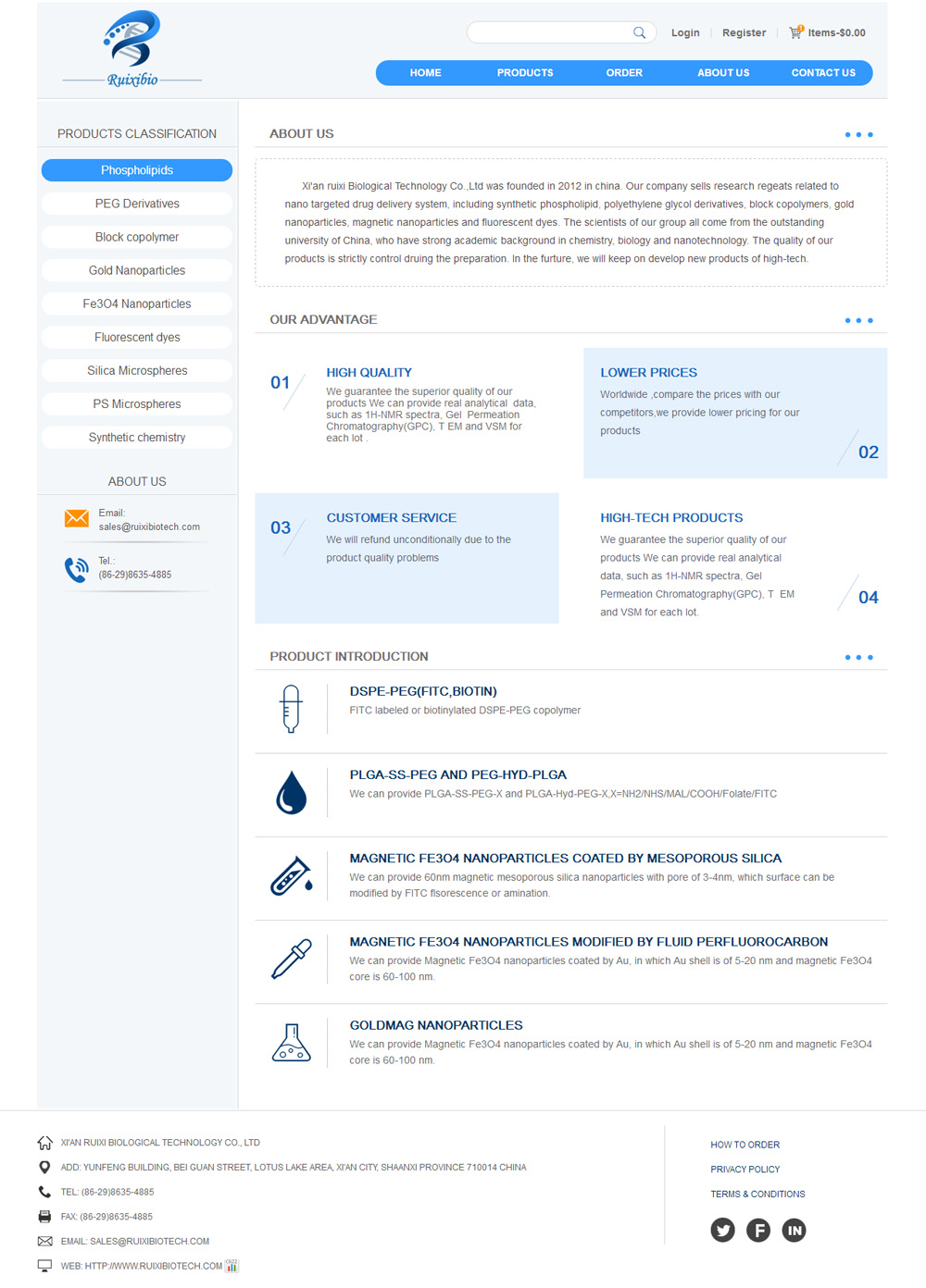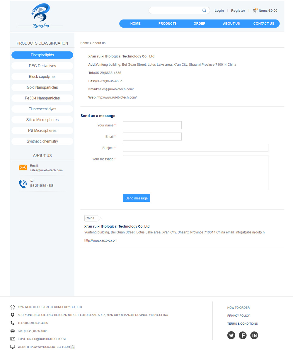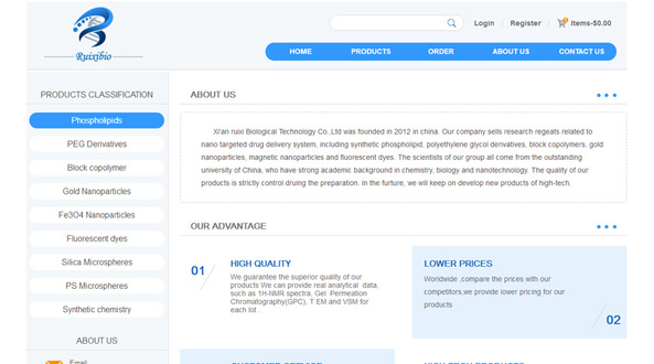 Xi'an ruixi Biological Technology Co.,Ltd was founded in 2012 in china. Our company sells research regeats related to nano targeted drug delivery system, including synthetic phospholipid, polyethylene glycol derivatives, block copolymers, gold nanoparticles, magnetic nanoparticles and fluorescent dyes. The scientists of our group all come from the outstanding university of China, who have strong academic background in chemistry, biology and nanotechnology. The quality of our products is strictly control druing the preparation. In the furture, we will keep on develop new products of high-tech.